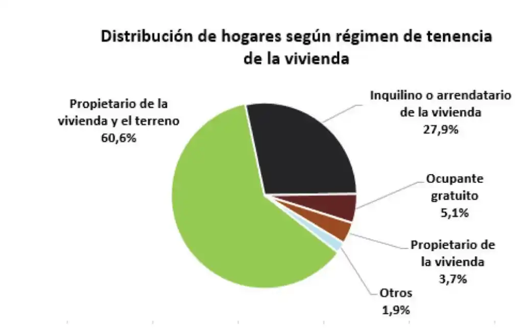 El porcentaje de distribución de hogares según el régimen de tenencia de la vivienda se completa con un 5,1 por ciento que es ocupante gratuito, un 3,7 propietario de la vivienda y un 1,9 a “otros”.