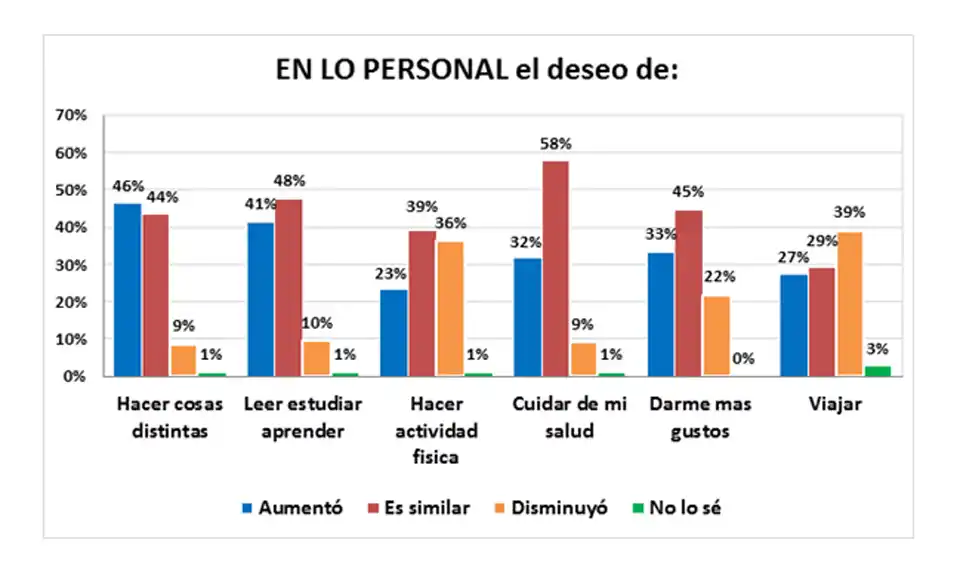 Desde el punto de vista personal, aumentó el deseo de realizar cosas distintas en la mayoría de los encuestados (229 totales), en tanto el ítem de “Viajar” en primer lugar y luego “Hacer actividad física” disminuyó con relación a los momentos previos a la cuarentena. El plano de “Cuidar mi salud” se mantuvo siempre similar a épocas anteriores.