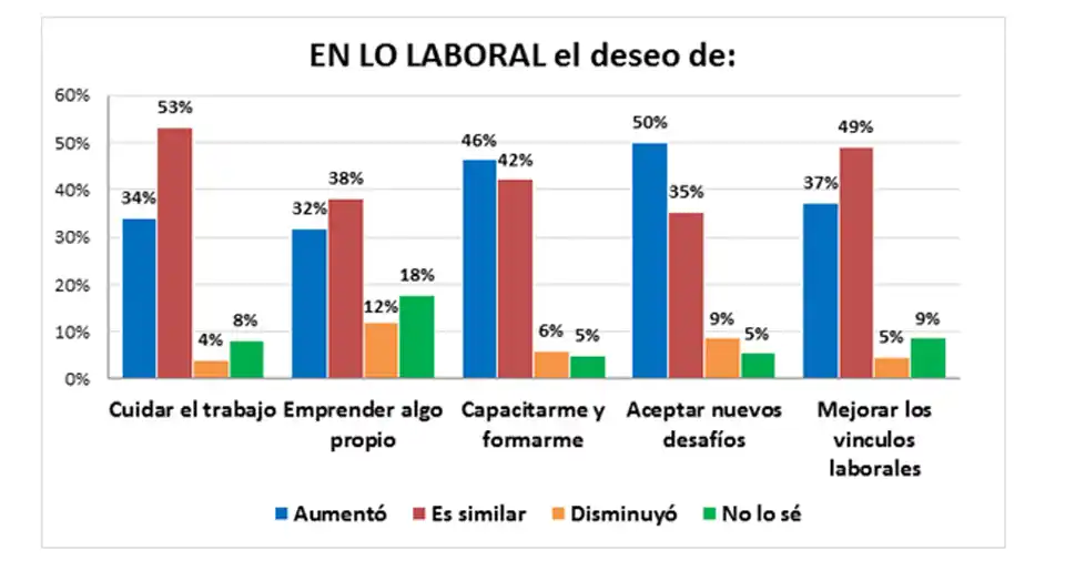 En lo laboral, el deseo de “Cuidar el trabajo” se mantuvo estable, aunque aumentó considerablemente. Entre los ítems que mayor incremento tuvieron en relación al análisis es el de “Aceptar nuevos desafíos” y “Capacitarme y formarme”.