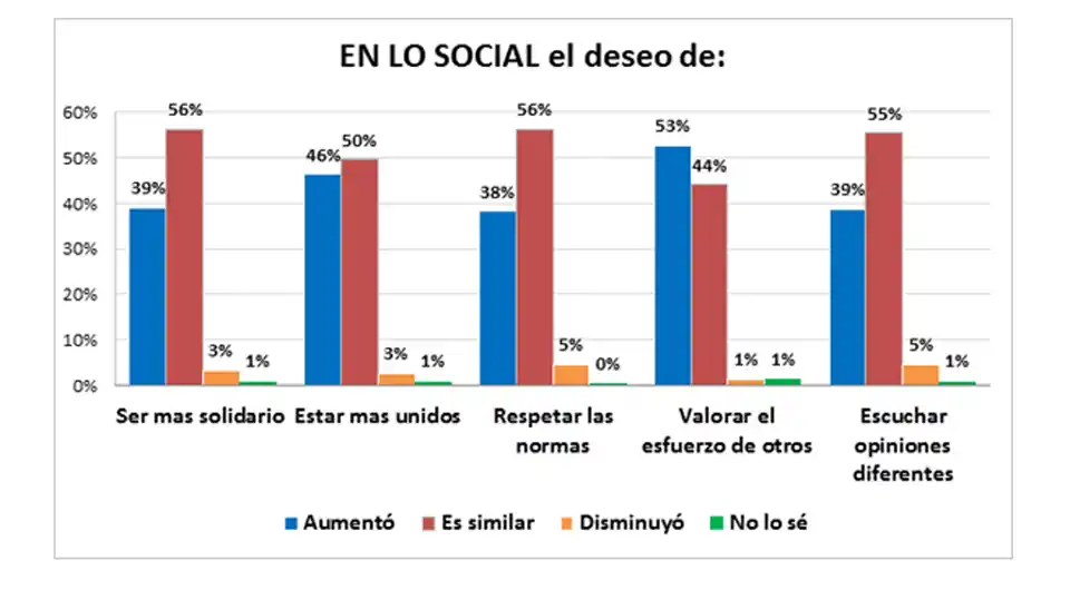 “Valorar el esfuerzo de los otros” fue el deseo en lo social que más se destacó en los encuestados. Más de 90 por ciento de las personas que participaron de la iniciativa lo señalaron así. Pero también hubo otros parámetros que lograron fuerte aceptación como “Respetar las normas” y “Ser más solidario”.