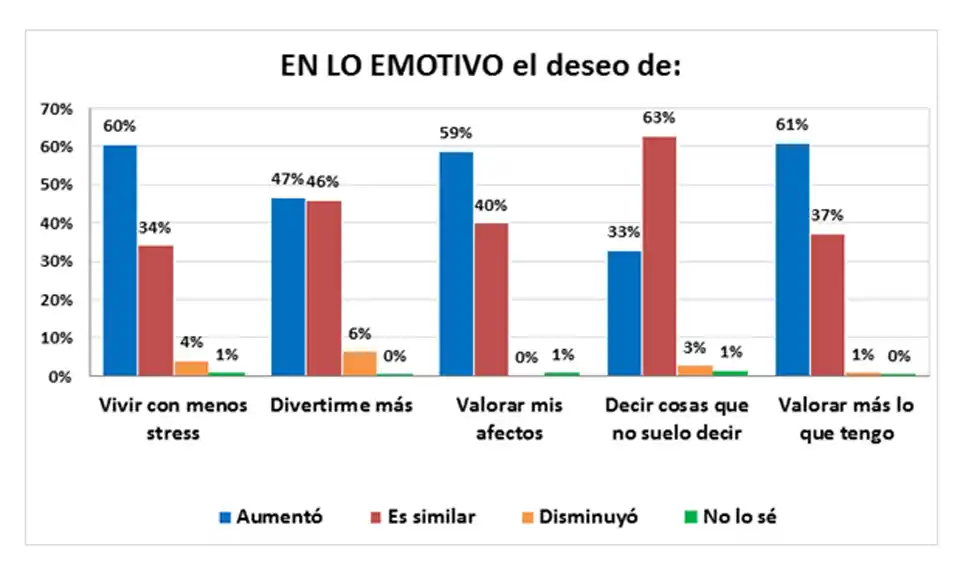 Por último, el ítem del deseo en lo emotivo y afectivo, sobresalieron las opciones de “Valorar más lo que tengo” y “Vivir con menos stress”, ejes claves de la vida post-pandemia que se viene para muchas personas.