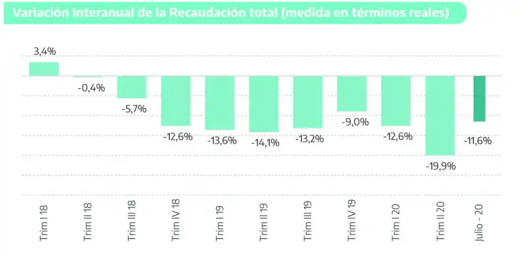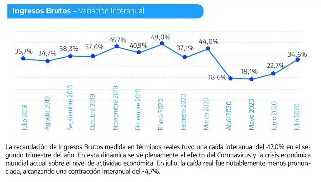 Accedé a las últimas noticias desde tu emailEl impuesto de mayor recaudación, Ingresos Brutos, totalizó 28.423 millones de pesos, con un incremento del 34,6 por ciento respecto de julio del año pasado. La merma en valores reales registrada por este tributo fue del 4,7 por ciento, lo que evidencia una mejora en relación con los meses anteriores, producto de un mayor nivel de actividad económica.