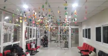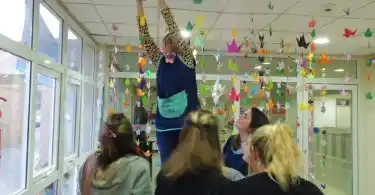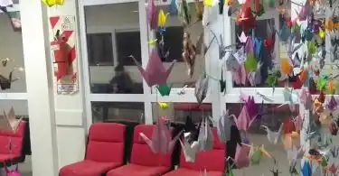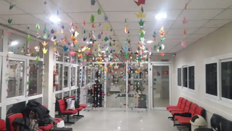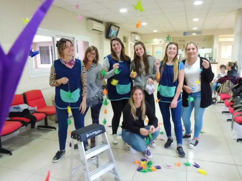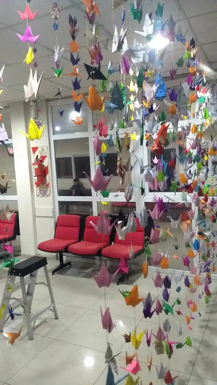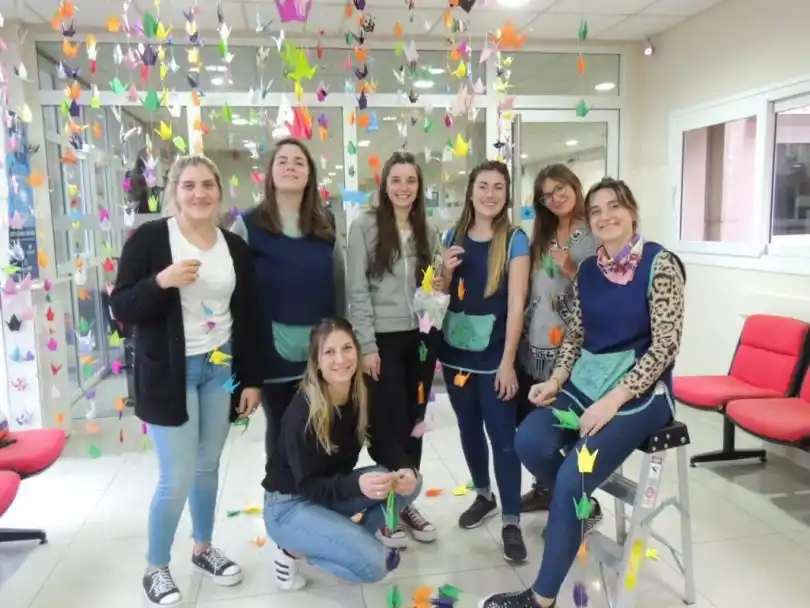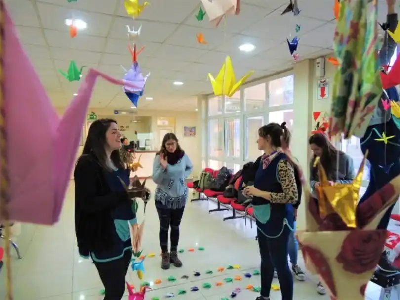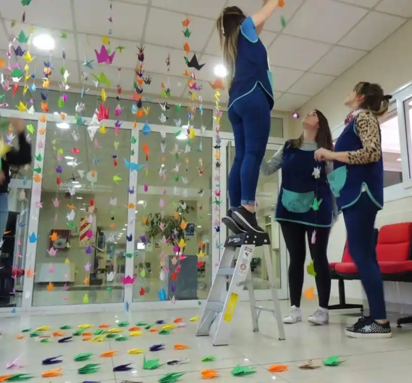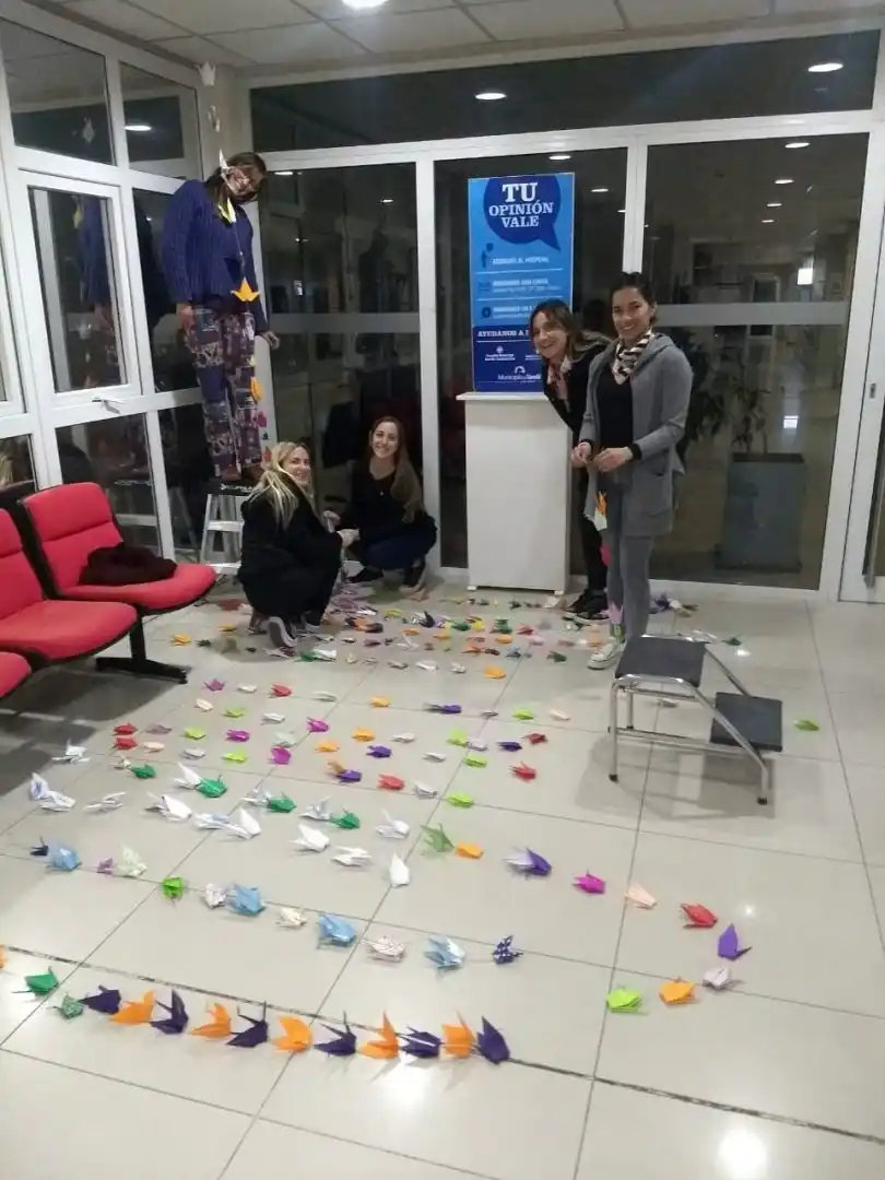 La comunidad educativa del Jardín Maternal y de Infantes Salta Violeta realizó una sorprendente instalación artística en el hall de acceso y espera del Hospital “Doctor Debilio Blanco Villegas”. Como un mensaje de paz y de buenos augurios para el Día del Niño, colgaron móviles con mil grullas de papel y transformaron radicalmente el espacio por el que ingresan los pacientes y sus familias.