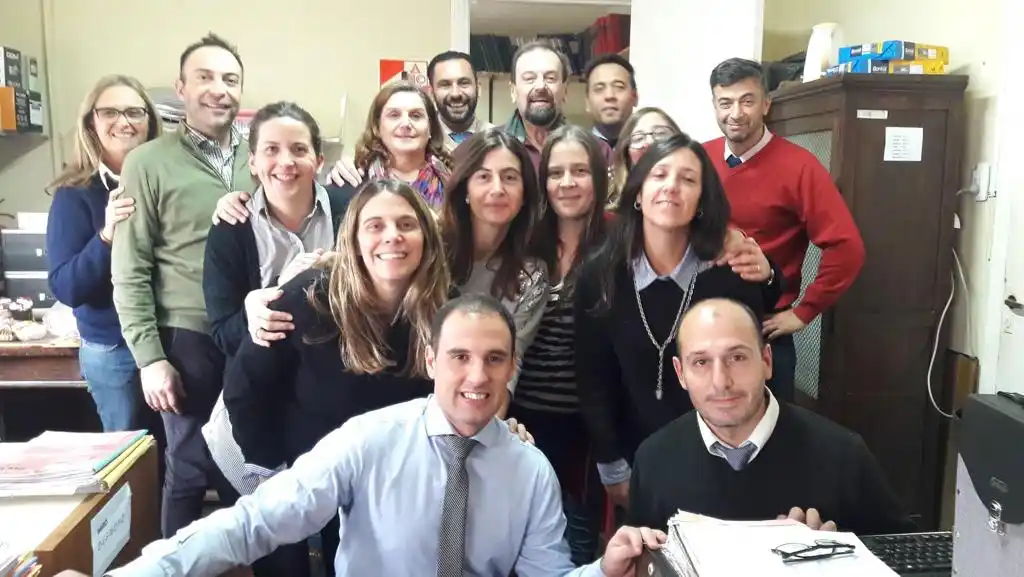FOTO JUZGADO En la foto del 2019, cuando el “tapaboca” era un elemento de alguna película distópica), de izquierda a derecha, Laura Bustos, Juan Pablo Mosquera, Victoria Otano, Mercedes Dabidós, Silvia Polich, José Zárate, Carolina Canale, Emiliano Caruso, Carlos Olazábal, Mariela Arbeo, Mario Rosas, María Laura Villamarín, Juliana Armendaris, Marcos Ross y Walter Moreno. Ausentes con aviso y súper justificado: María Laura Iametti, Venecia Sartor y Pía Scotoni.