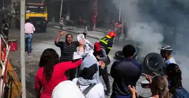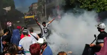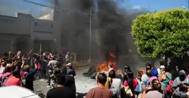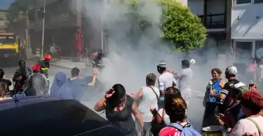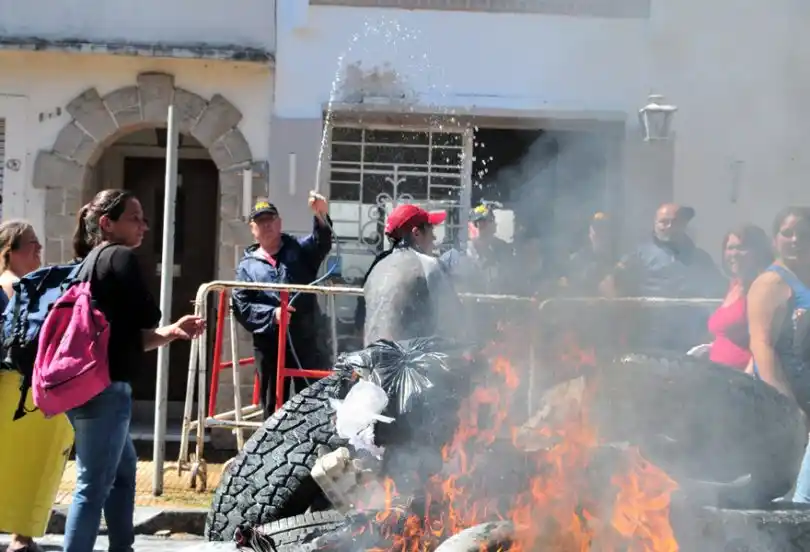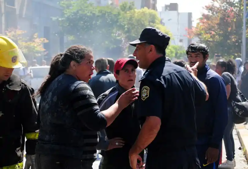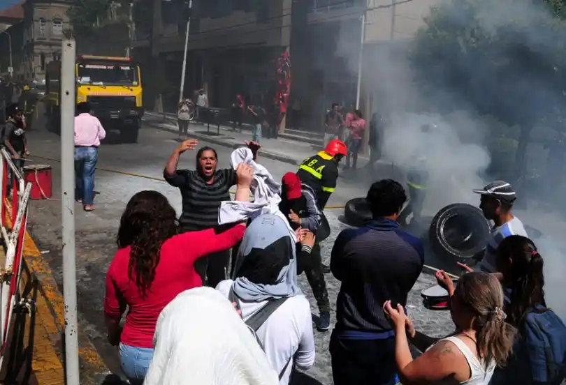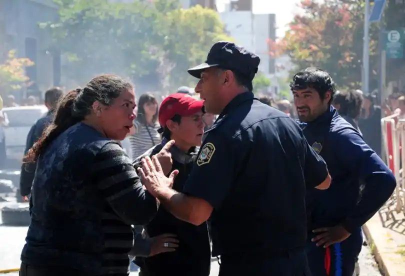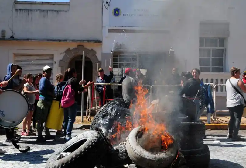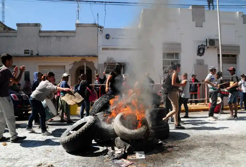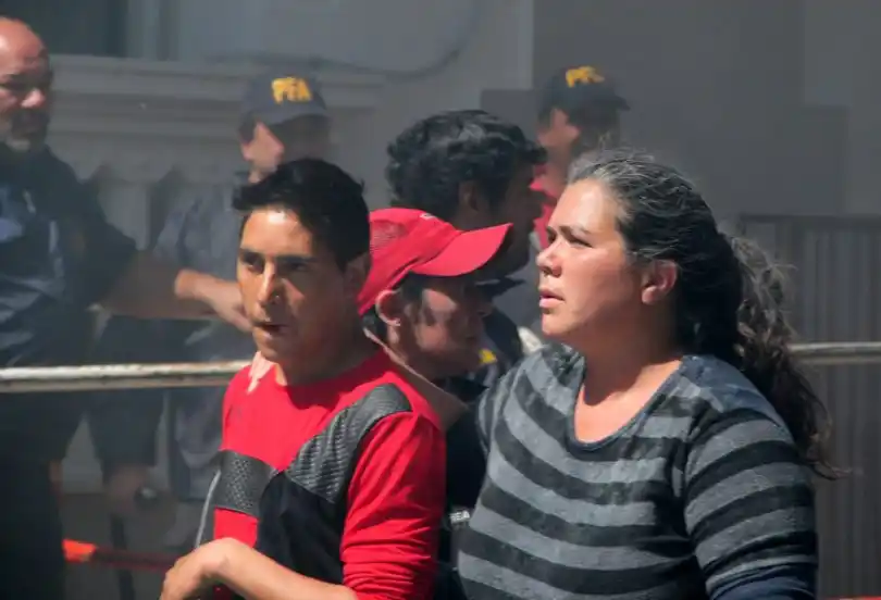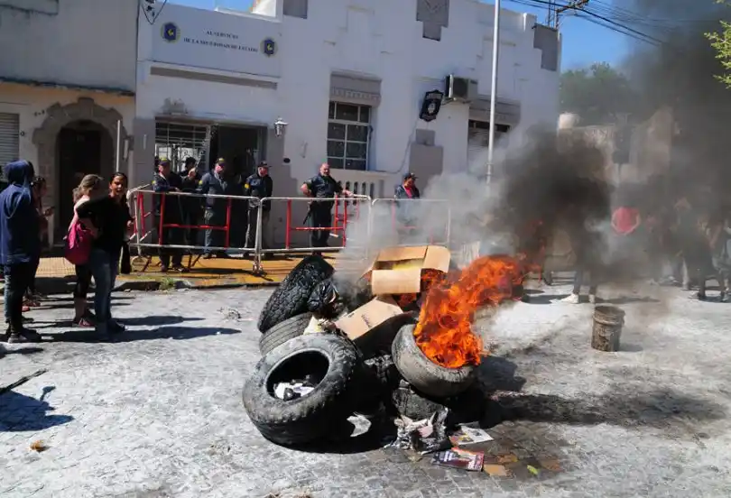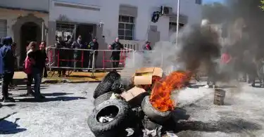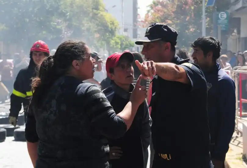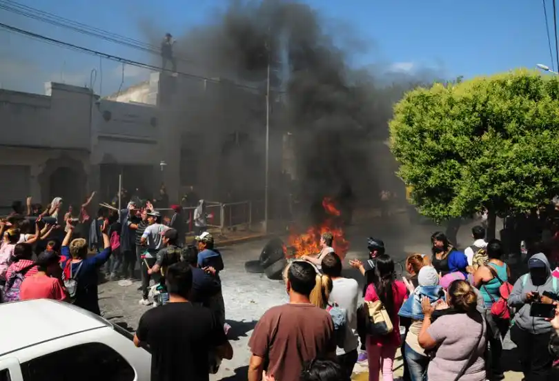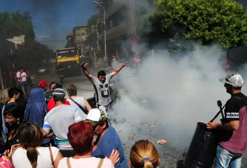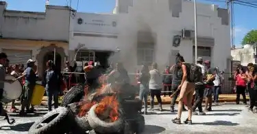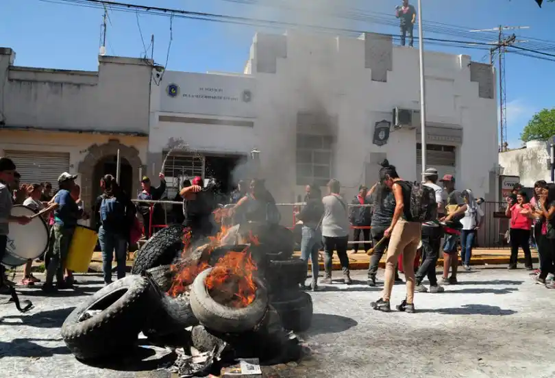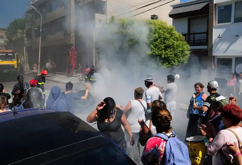 El caos se desató cuando arrojaron baldes repletos de desechos cloacales al personal policial. Esto obligó a algunos efectivos a entrar al edificio a limpiarse y los agrupados aprovecharon para armar una fila de gomas para quemar. Con un matafuegos y una manguera hogareña, la Policía intentó evitar el fuego, sin lograrlo. El humo de las grandes llamaradas cubrió la cuadra.