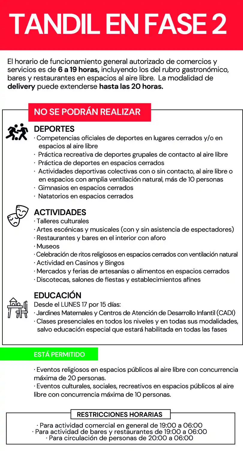 A través de un comunicado, desde el Municipio ratificaron que en “Tandil regirán todas las medidas dispuestas por Provincia para la Fase 2. Ante esta segunda ola, que golpea de manera casi uniforme en todo el país y con características muy distintas a la primera, se requiere la máxima coordinación y esfuerzo conjunto de todos los niveles del Estado”.