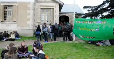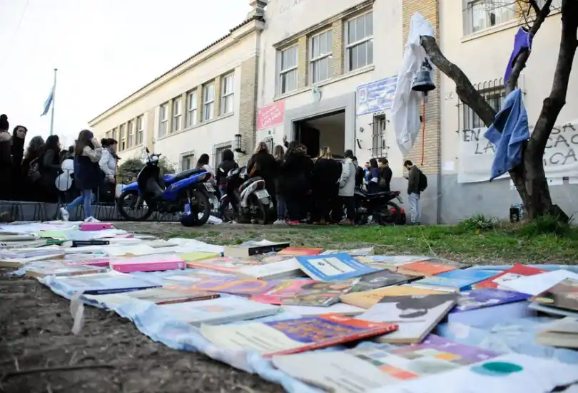 “La educación no se vende, se defiende”, rezaba una de las banderas colgadas al frente de la institución, además de haber dispuesto sobre el pasto una extensa variedad de libros.