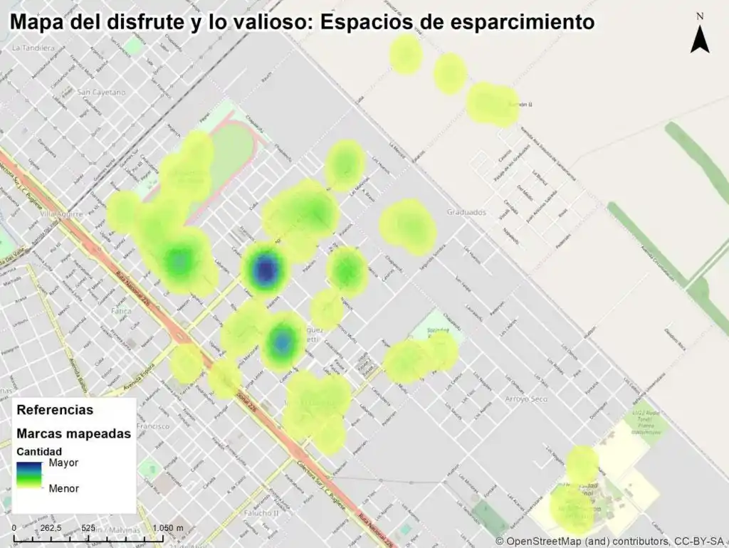 Al observar los mapas en que se trabajó con la consigna: ¿Qué espacios, cosas, acciones nos parecen valiosos y disfrutamos de nuestro barrio? fueron mapeados diferentes espacios donde aparecen actividades al aire libre como caminatas, andar en bici, tomar mate, jugar al fútbol u otro deporte, etc.