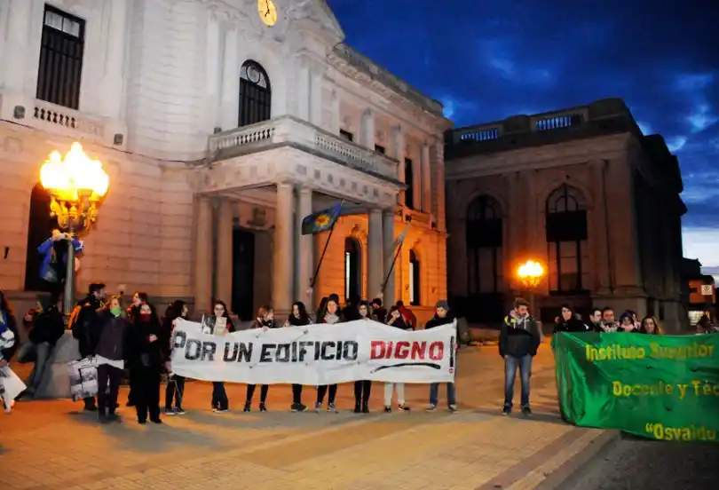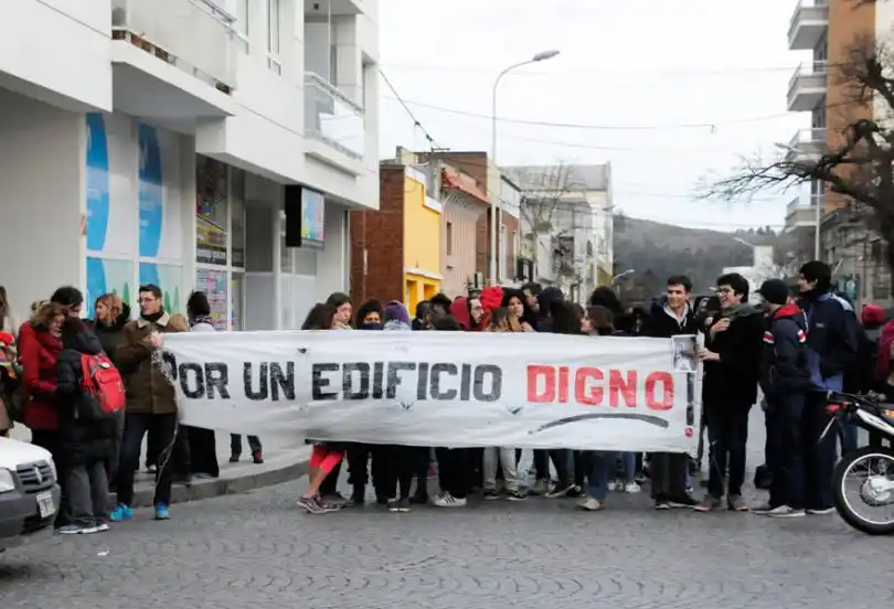 Bajo la consigna “Por un edificio digno”, estudiantes, directivos, docentes y referentes gremiales se encolumnaron hacia la Municipalidad por Belgrano. Uno de los alumnos sostenía un cartel con fotografías que reflejaban el avanzado estado de deterioro del edificio.