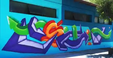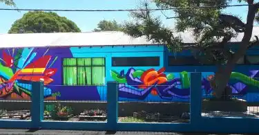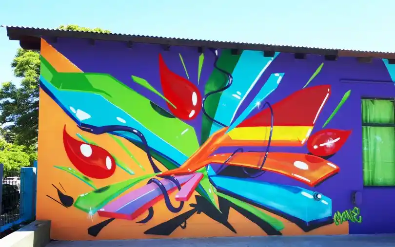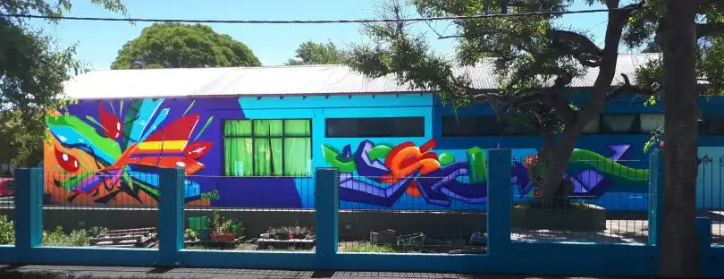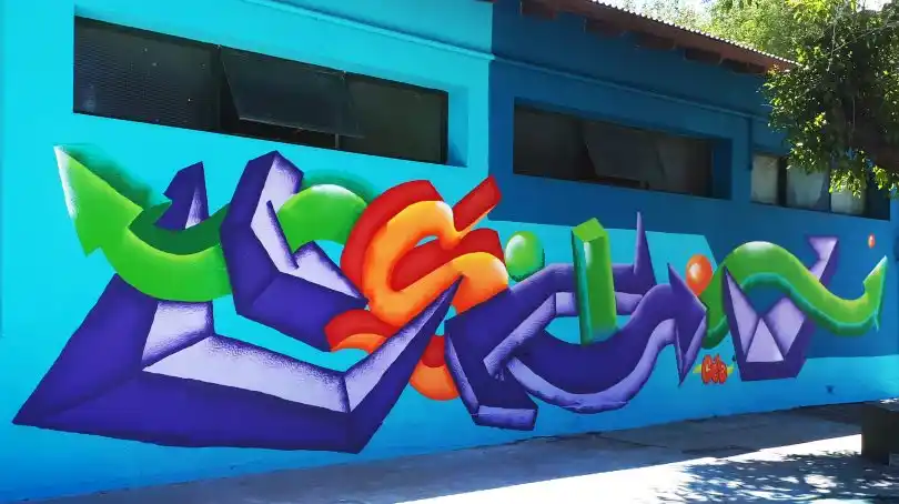 Las figuras principales son dos piezas de graffiti de gran tamaño en el frente, y otras dos en la cancha donde los chicos juegan en los recreos.