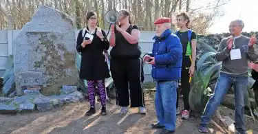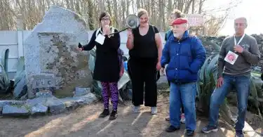 La guía turística se detuvo en el monumento levantado en 2006 en ocasión de cumplirse el centenario de la creación del primer sindicato local de la piedra, obra encargada por AOMA (Asociación Obrera Minera Argentina) y ejecutada por Jesús Duarte y Eduardo Rodríguez del Pino en honor a los “hombres de la piedra”. Las alumnas de las escuelas involucradas en el trabajo, recordaron que el monumento es un homenaje al proceso de lucha de los trabajadores que se organizaron para conquistar sus derechos laborales.