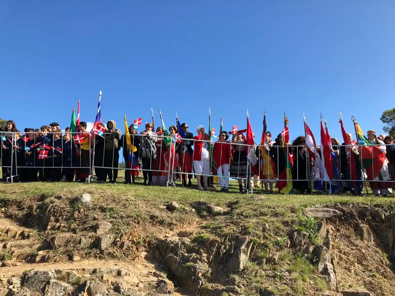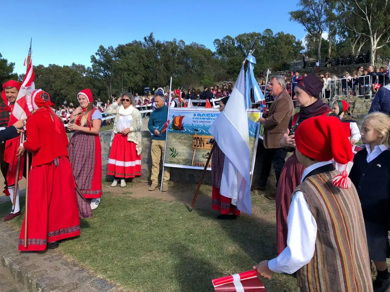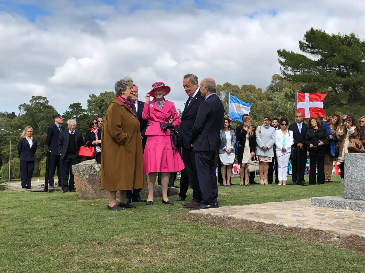 La comunidad danesa esperando por la Reina en el monumento a Juan Fugl