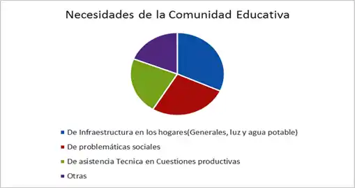 En cuanto a las necesidades que estos actores identifican en la comunidad educativa, el índice de respuesta muestra que hay falencias en la infraestructura de los hogares (servicios básicos), problemáticas sociales y asistencia técnica en cuestiones productivas, entre otras cuestiones ligadas a las adicciones, maltrato familiar, educación sexual, crianza y cuidados de la salud.
