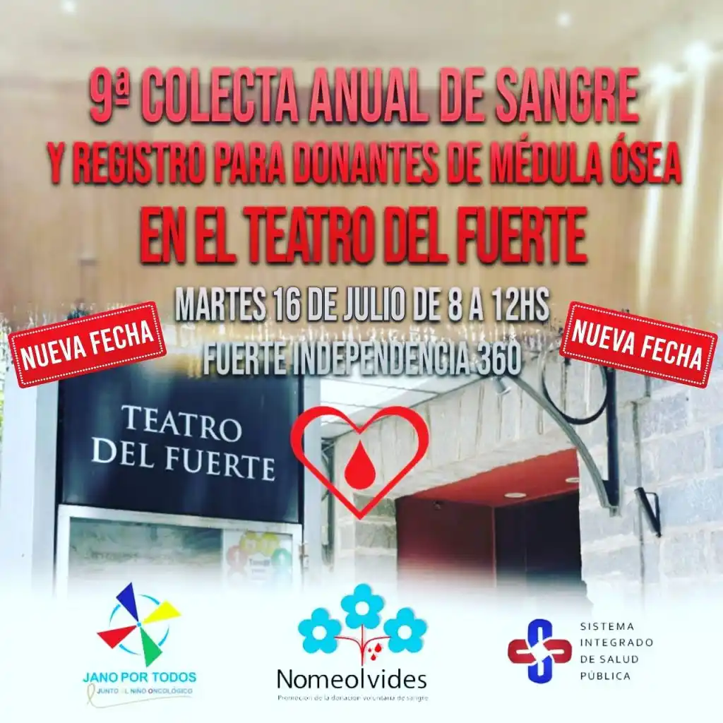 La ONG Jano por Todos, el grupo No Me Olvides y el servicio de hemoterapia del Sistema Integrado de Salud Pública (SISP) llevarán a cabo una nueva colecta anual de sangre y registro para donantes de médula ósea. La convocatoria, que había sido pautada para mediados de junio y suspendida por el alerta meteorológico de semanas atrás, finalmente pasó para el martes que viene, 16 de julio, en el Teatro del Fuerte, de 8 a 12.
