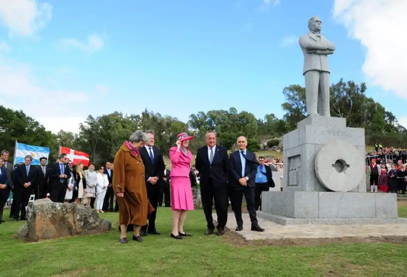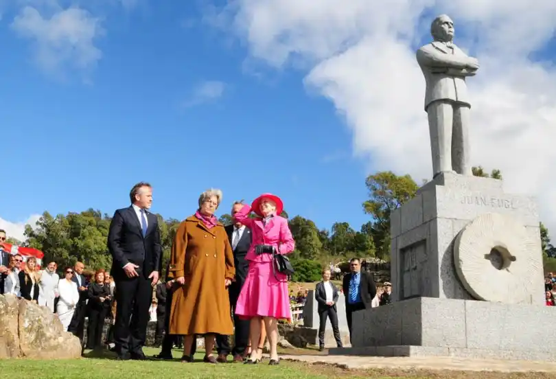 Una vez frente a la estatua que glorifica a uno de los adalides de la génesis de la ciudad, conversó unos minutos con las autoridades y contempló la magnífica vista del Lago del Fuerte. En una mañana que vislumbró el clima otoñal de la estación que comienza hoy, su Majestad tuvo que hacerle frente al intenso viento que soplaba y amenazaba constantemente con hacer volar su sombrero.