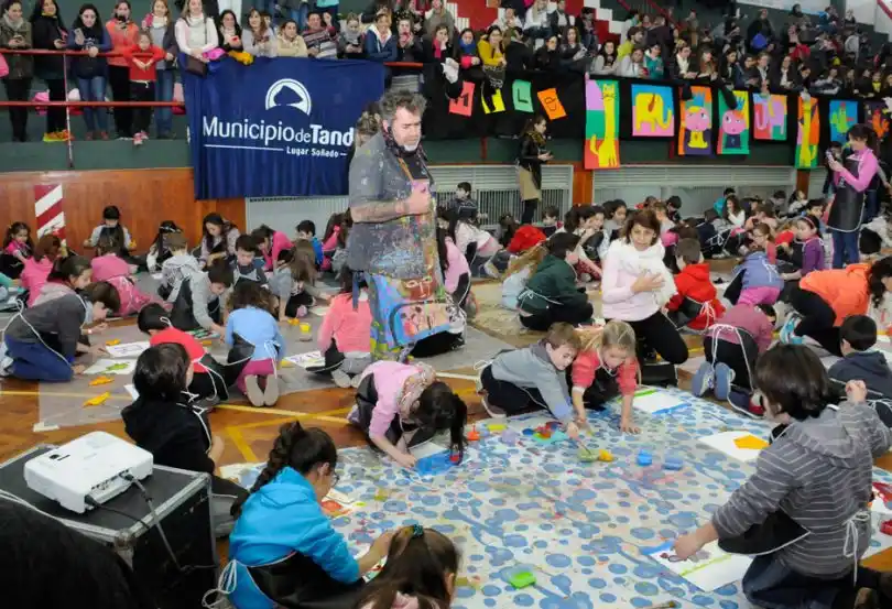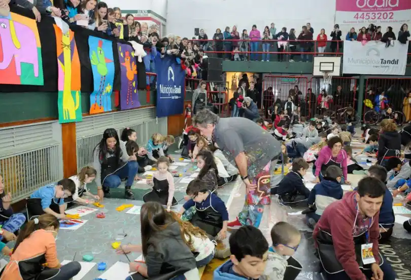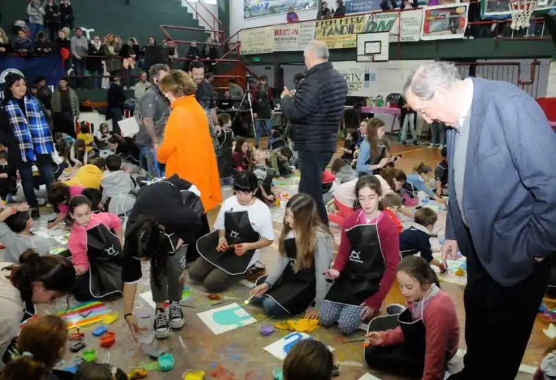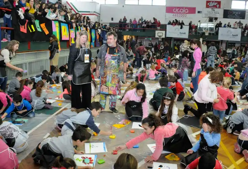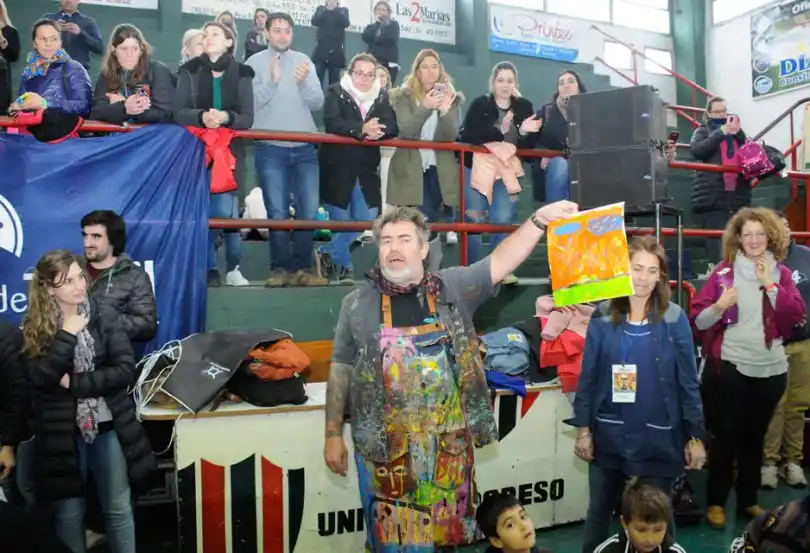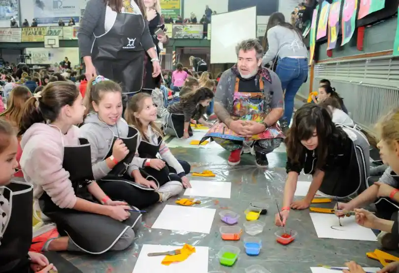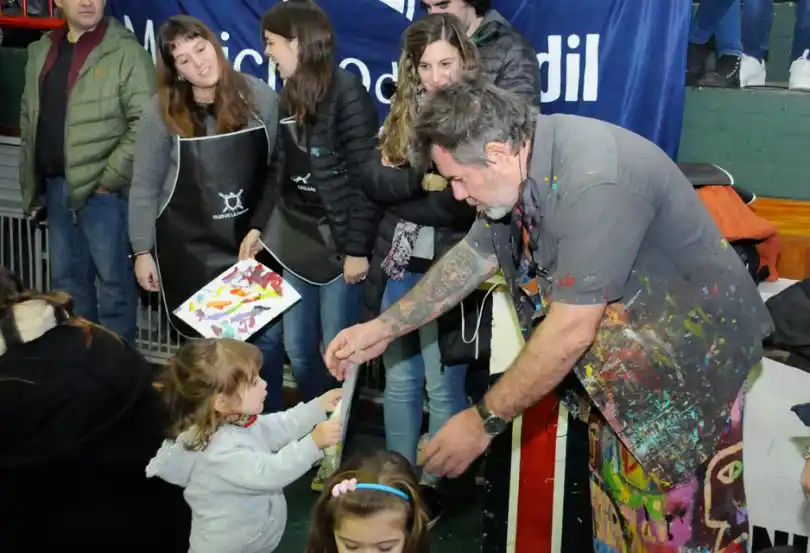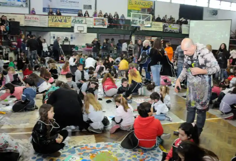 Este sábado, 500 chicos de entre 5 y 10 años llenaron de color y alegría el gimnasio del gigante de Villa Italia, para participar del taller de pintura gratuito que el artista plástico chaqueño realizó junto a su equipo con la organización del Municipio de Tandil. A fines de abril había arribado a la ciudad en el marco del programa provincial AcercArte para desarrollar una propuesta más acotada, que habilitaba el ingreso de solamente 50 chicos, razón por la cual muchos de los que quedaron afuera en ese entonces pudieron tener revancha en esta ocasión.