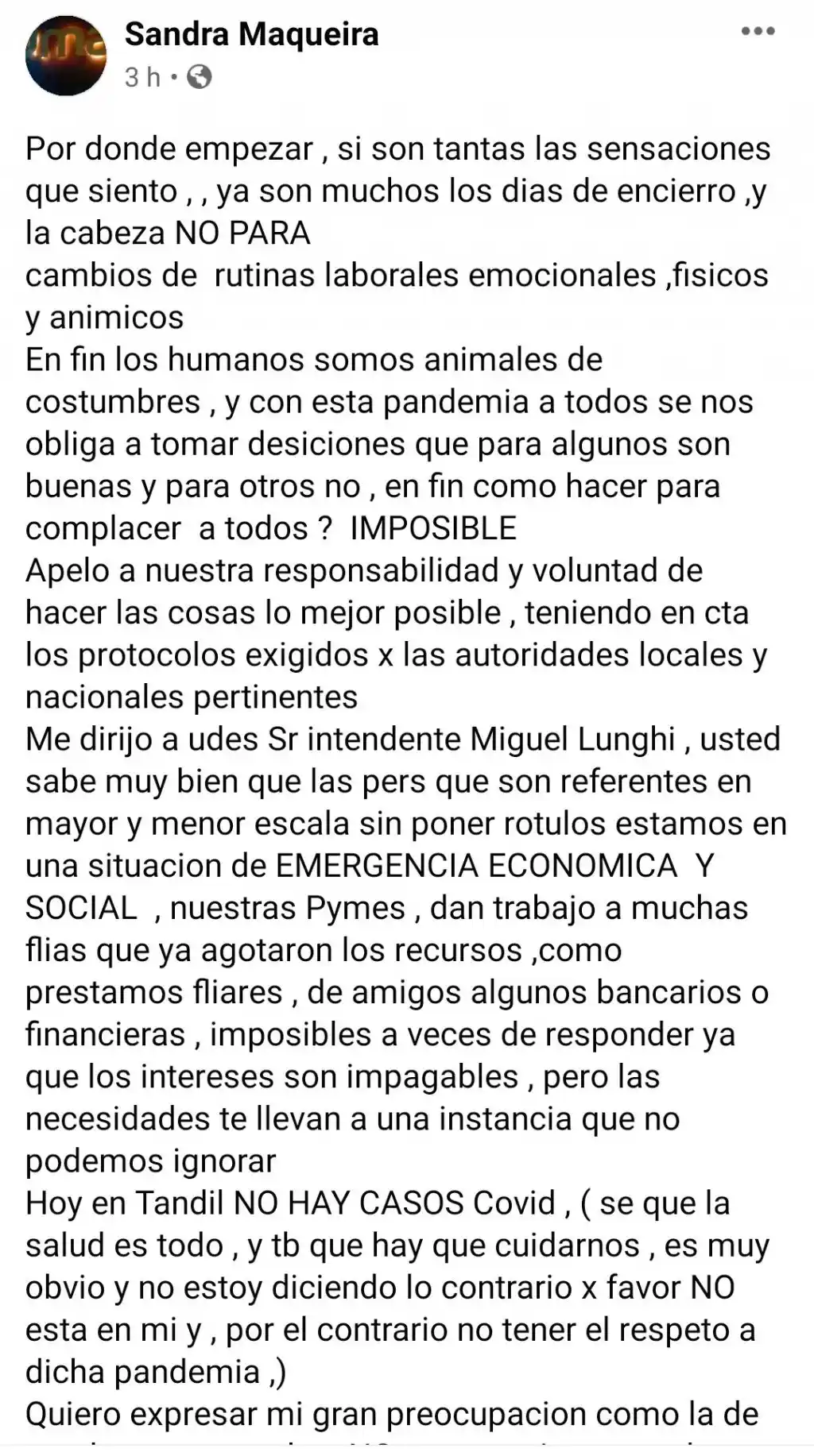 La empresaria y emprendedora Sandra Maqueira, vinculada con la nocturnidad, escribió un fuerte posteo en Facebook sobre la compleja situación que están atravesando desde el rubro producto de la cuarenenta y la imposibilidad de desarrollar su actividad.