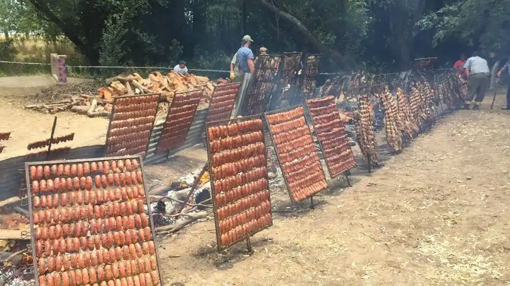 Sobre las brasas, los nueve encargados se ocuparon de asar 1200 chorizos y 600 kg de carne.