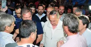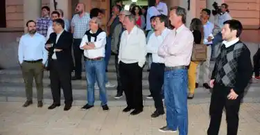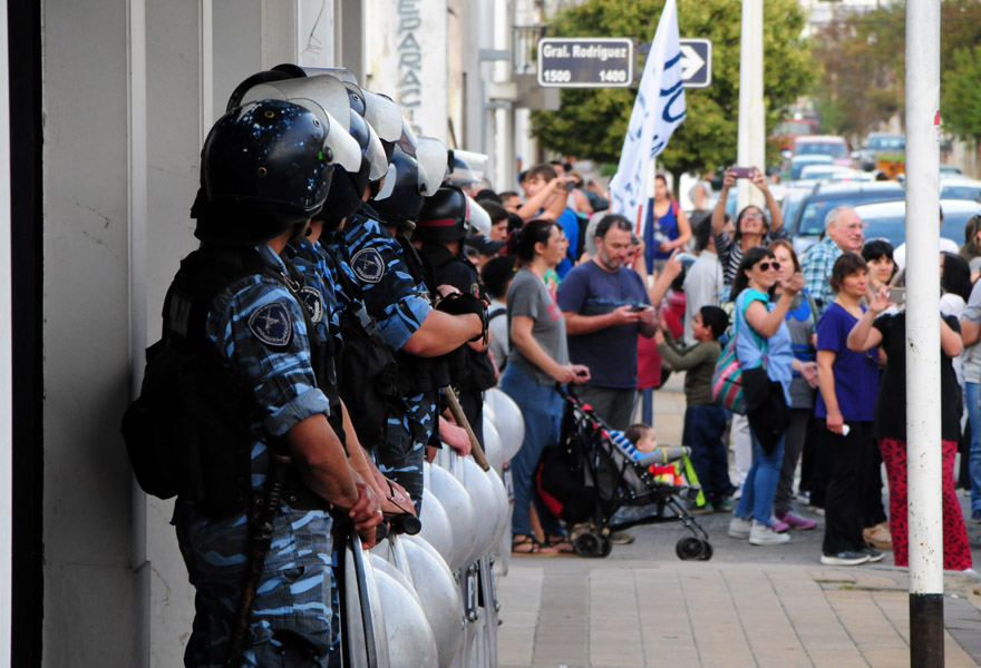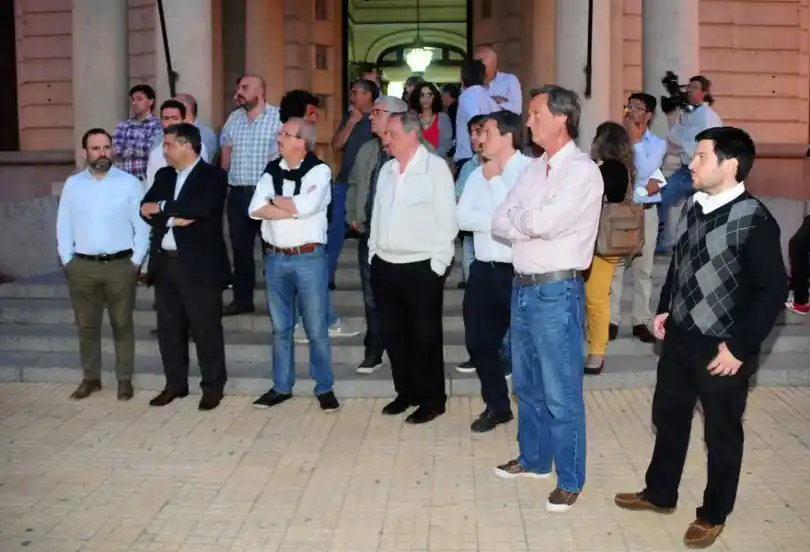 Tras una breve escala en la concesionaria oficial de Renault, en Arana y Rodríguez, la columna de manifestantes llegó hasta las puertas de la Municipalidad, donde se encontraba el intendente Miguel Lunghi y todo su gabinete.
