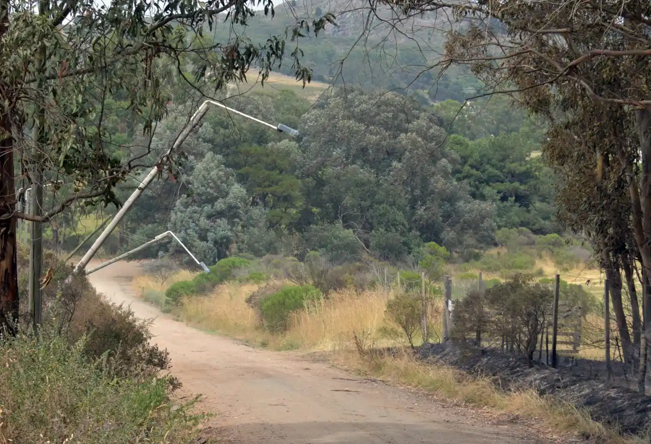 Trabajadores de diferentes prestadoras de servicios se hicieron presentes en el camino lateral de El Valle de Tandil que conduce al hotel Amaike para reponer los postes que habían sufrido la feroz embestida del fuego, que avanzó a gran velocidad.