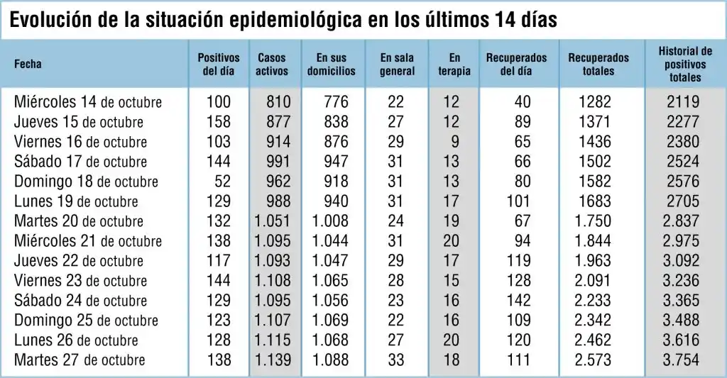Minutos después de las 22, el comité de profesionales precisó que en la ciudad hay 1.139 personas que cursan la enfermedad, al informarse sobre 111 altas médicas, mientras que el historial de positivos totales es de 3.754 desde marzo.