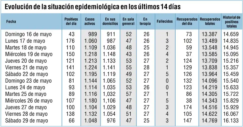 En términos globales, las cifras que reflejan el estado de situación del sábado indican que el historial de positivos quedó en 16.133 y el de recuperados en 14.769.