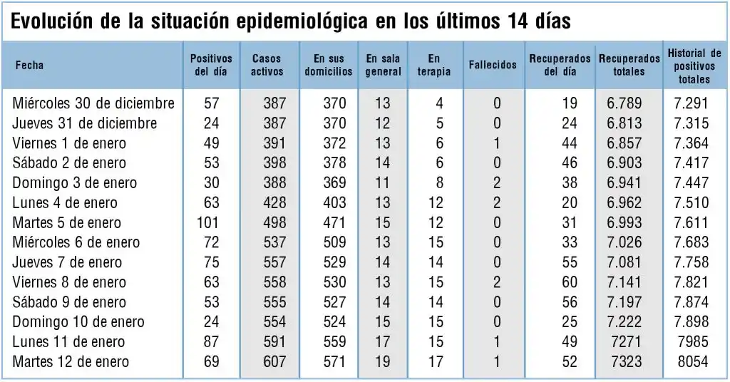 Actualmente hay 607 casos con Covid-19, 17 en terapia intensiva o intermedia y 19 en sala general.