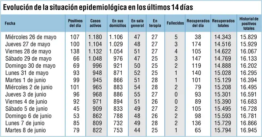 Los casos activos presentaron un incremento. Con 65 personas se sumaron a la lista de recuperados, 79 nuevos positivos y un fallecido, hay 822 ciudadanos que cursan la enfermedad, de los cuales 753 se recuperan en sus domicilios.