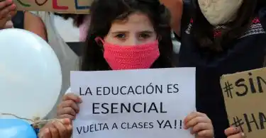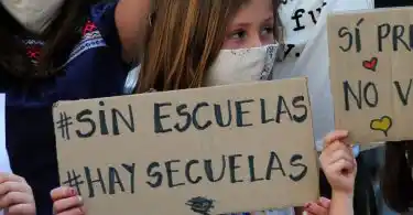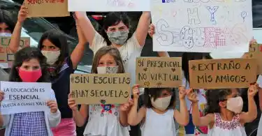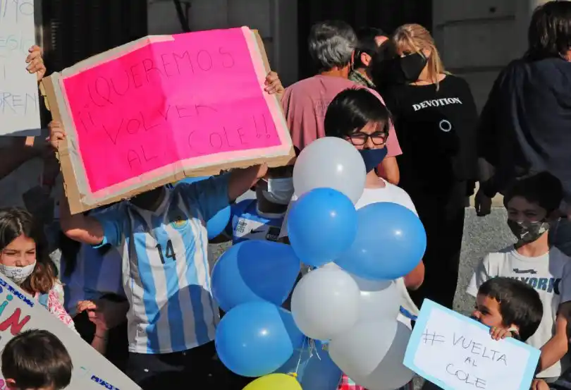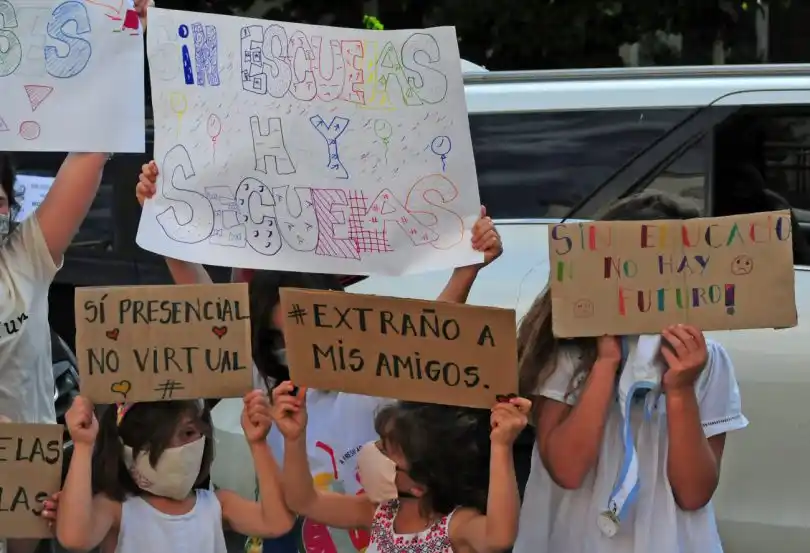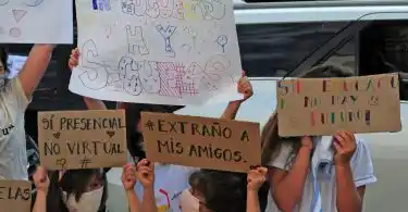 Al canto de “Aulas abiertas” y “educación” alzaron sus voces al unísono mientras los pequeños niños que participaban de la manifestación sostenían carteles que decían “extraño a mis amigos”, “queremos volver al cole”, “Vuelta a clases ya”.