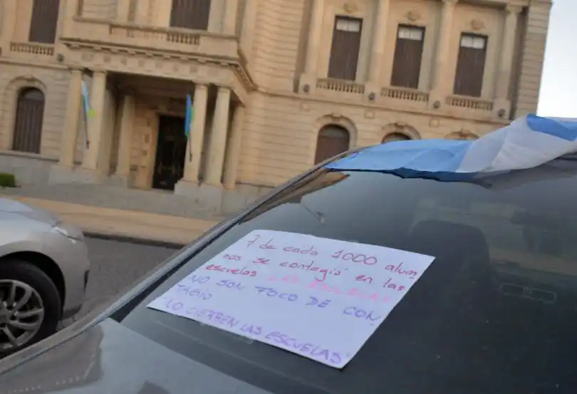 “Siete de cada 1000 alumnos se contagió en la escuela. Las escuelas no son foco de contagio. No las cierren”, “Más de 450 mil vacunas a docentes y suspenden las clases presenciales”, “Alumnos sin clases genera más pobreza y menos futuro. No al cierre de las escuelas”, decían otras leyendas en automóviles que participaban de la caravana.