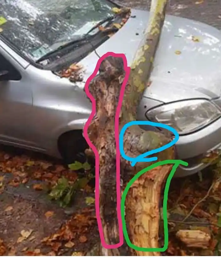 Con una imagen marcada con diferentes colores, Jaureguiber evidenció en el gajo caído el lugar del que estaba sujeto a la planta (verde); los problemas de hongos y bacterias que tenía el árbol producto del descope (rosa) y el diámetro (celeste).
