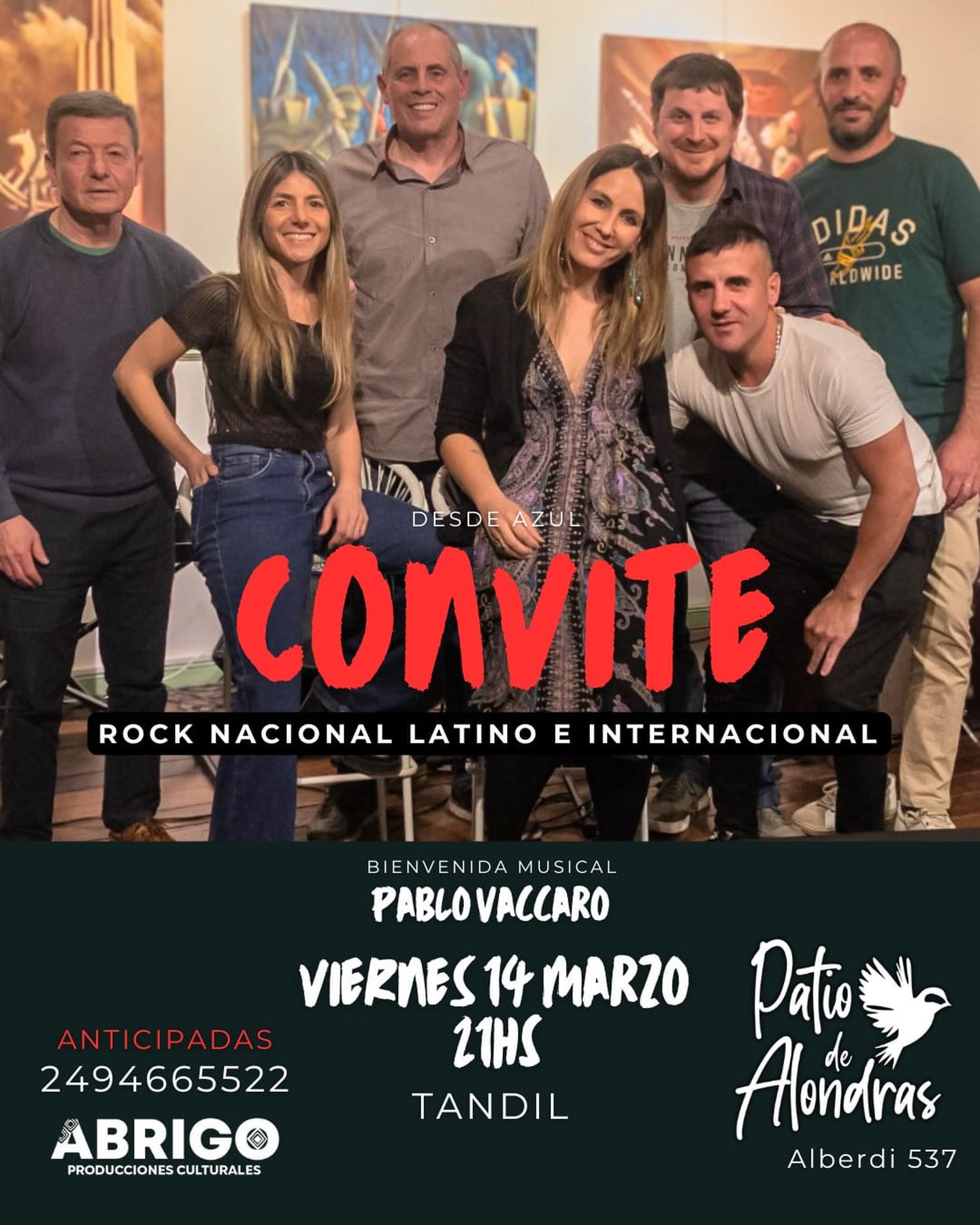 Este viernes, a las 21, en el Patio de Alondras (Alberdi 537), se presentará la banda Convite, que llegará desde Azul para entregar su música de rock nacional, latino e internacional, en formato acústico.