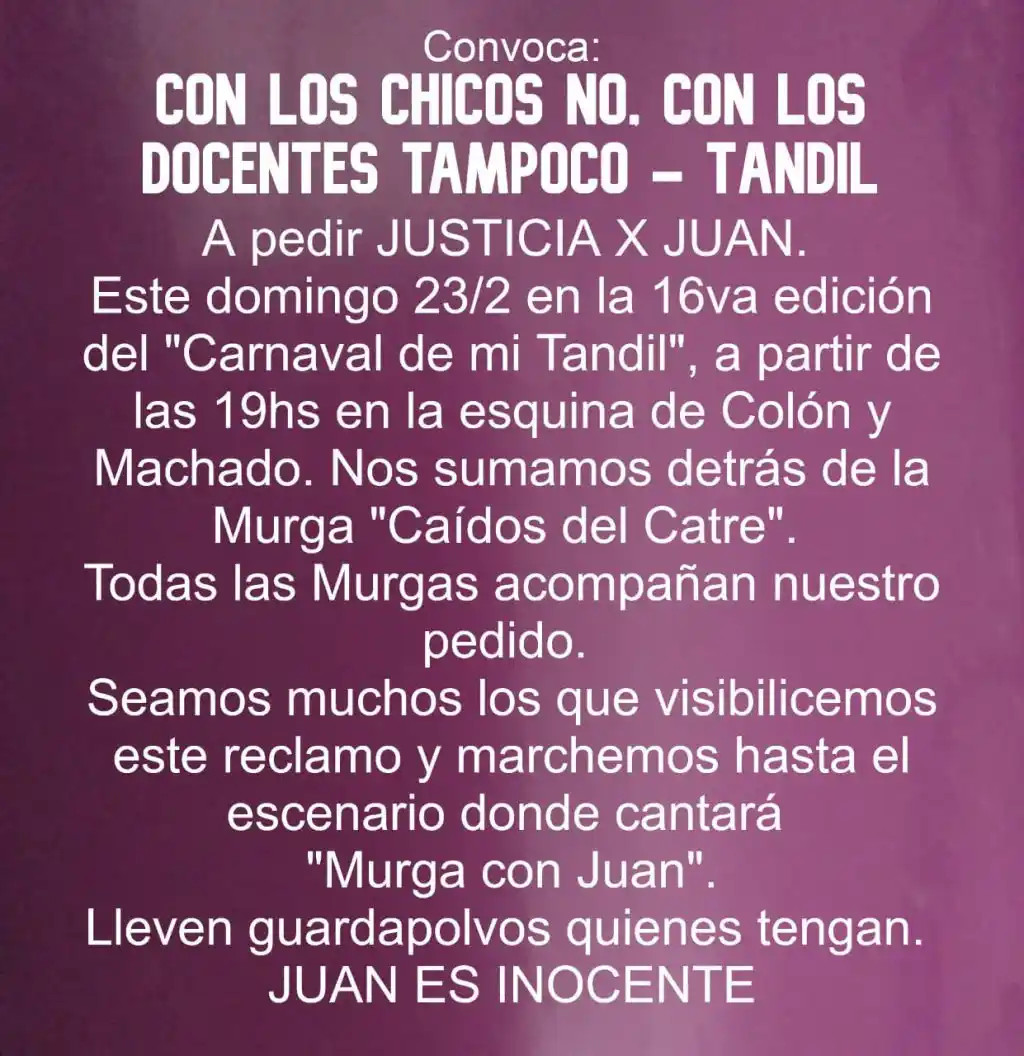 Accedé a las últimas noticias desde tu email“Justicia por Juan. Este domingo 23/2 en las 16va edición del ‘Carnaval de mi Tandil’, a partir de las 19 horas en la esquina de Colón y Machado. Nos sumamos detrás de la murga de ‘Caídos del Catre’”, informaron a través de un comunicado que compartieron.
