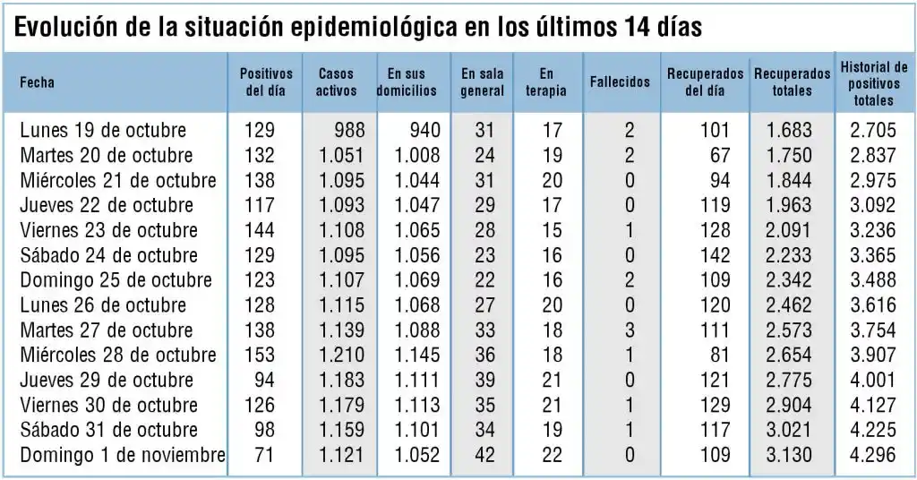 En la ciudad actualmente hay un total de 1121 casos con Covid-19 y el historial de positivos totales ascendió a 4296.