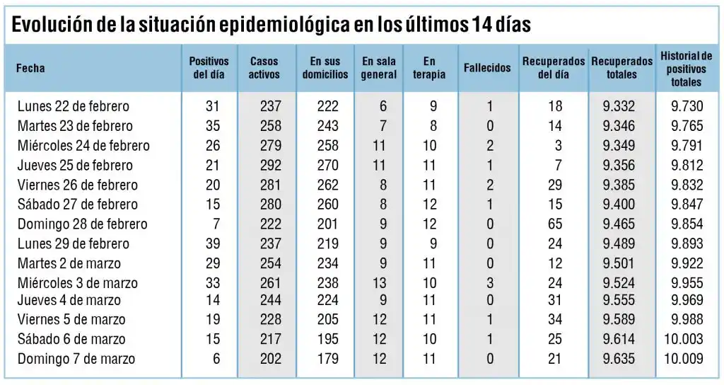 Actualmente hay 202 casos con coronavirus, de los cuales 11 se encuentran alojados en las áreas de terapia intensiva o intermedia y 12 ocupan camas en sala general.