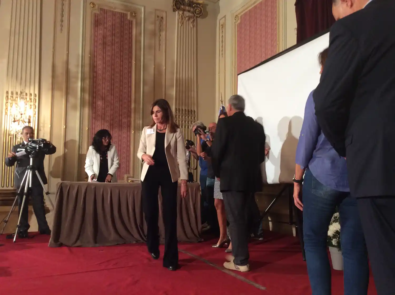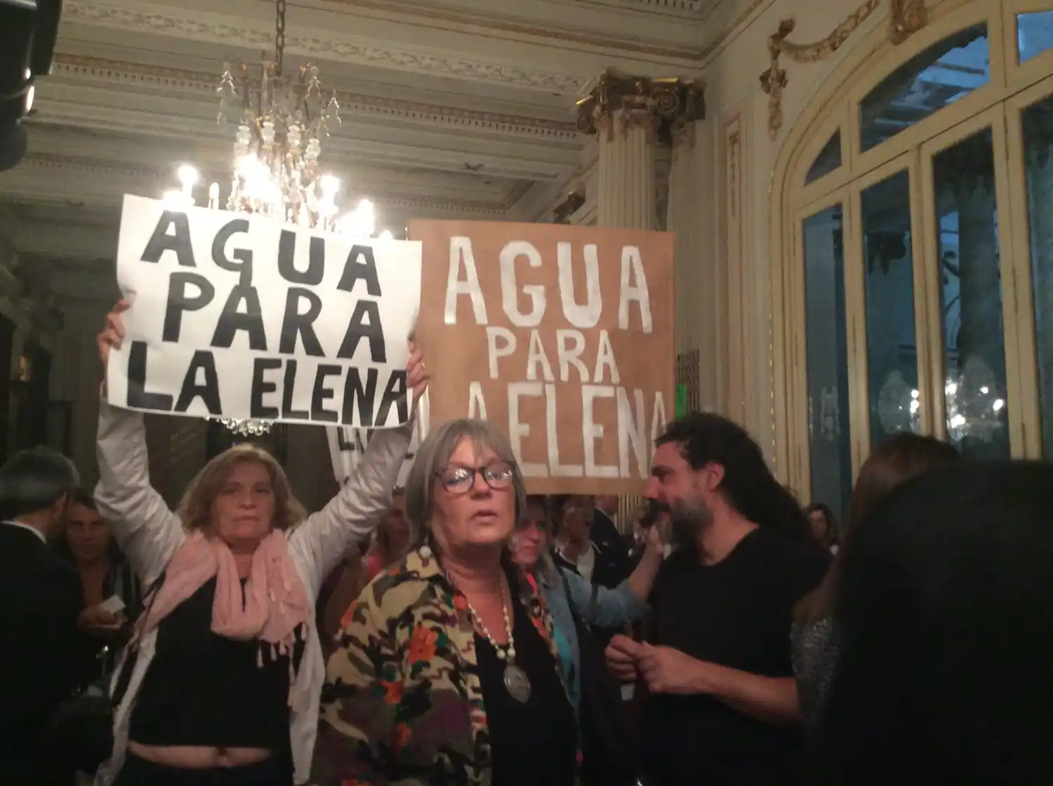 En el fondo del Salón Blanco se ubicaron algunos vecinos del barrio La Elena, quienes alzaron pancartas y carteles reclamando el servicio de agua para la zona, sostenido desde hace tiempo.