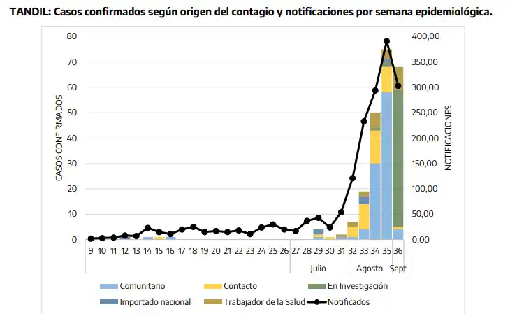 De acuerdo a los datos oficiales informados por el Municipio a la Provincia, desde el inicio de la pandemia y hasta el 6 de septiembre, el Municipio de Tandil acumuló 230 casos confirmados de coronavirus. El 92 por ciento de estos casos (212) ocurrieron a partir de agosto, mes en el cual se observa un incremento brusco de la curva, más marcado en la segunda quincena de ese mes.