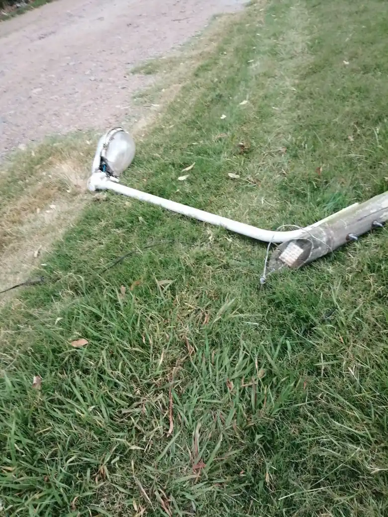 Luego de constatar que no era un desperfecto en mi casa, me dirigí al pilar de entrada y comprobé que todo “estaba aparentemente bien”. Llamamos a la Usina, que, en mi experiencia personal, tiene mucha eficiencia en la respuesta a los problemas. Cuando ellos llegaron ya estaba “clareando”. Tal fue mi sorpresa cuando, con los operarios de la Usina, nos dimos cuenta de que faltaba una luminaria en la ruta; al acercarnos vimos lo que estas fotos transcriben.
