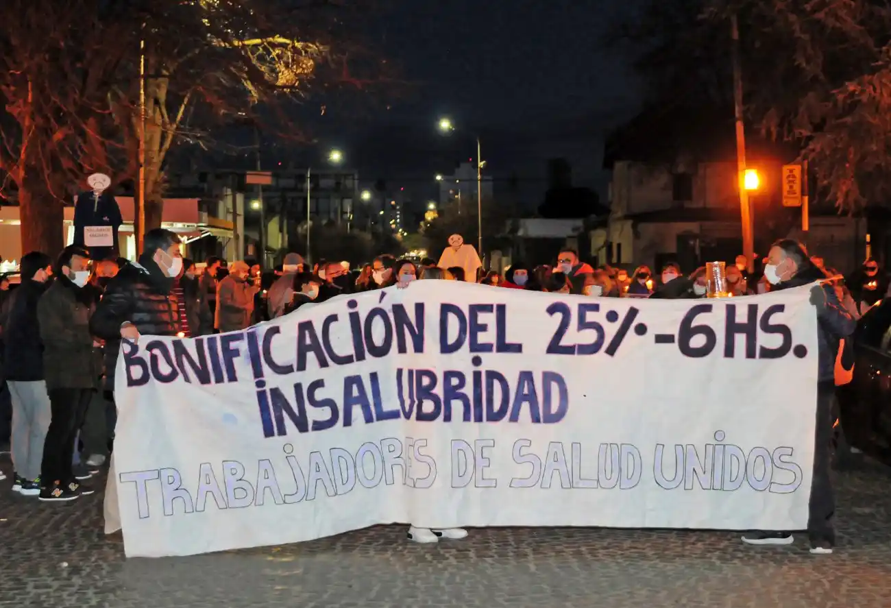 Cerca de 18.30 los trabajadores se encolumnaron detrás de la leyenda “Bonificación del 25 por ciento. Seis horas. Insalubridad. Trabajadores de la salud unidos” y se movilizaron alrededor de las instituciones sanitarias a modo de abrazo, con sus antorchas y en completo silencio.