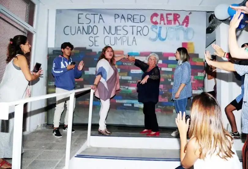 Por último, todos los presentes se acercaron a donde estaba el muro que separaba la parte del edificio que ya estaba terminada de la que estaba en construcción, que fue derribado días atrás. Sin embargo, de modo simbólico, colocaron allí una inmensa bandera que decía “Esta pared caerá cuando nuestro sueño se cumpla”. Y al retirarla, se produjo la unión definitiva de ambas partes del edificio y, después de 28 años, el sueño finalmente se hizo realidad.