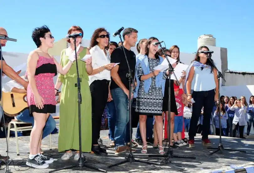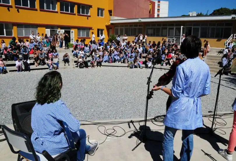 Después de recibir la Bandera de ceremonia de Polivalente y de otras escuelas que acompañaron, profesores y alumnos de sexto de música y artes visuales tocaron el Himno, junto al maestro y destacado músico Nelson Castro.