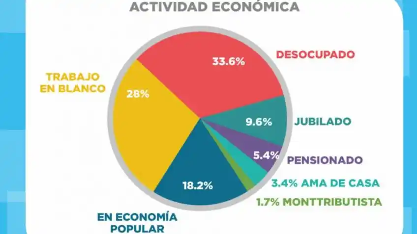 Con respecto al nivel de empleo, el informe arrojó que el 33,6 por ciento de las personas encuestadas está desocupada; el 28 por ciento tiene un trabajo en blanco; el 18,2 por ciento trabaja en la economía popular; el 9,6 por ciento está jubilado; el 5,4 por ciento es pensionado; el 3,4 por ciento se desempeña como ama de casa y el 1,7 por ciento es monotributista.