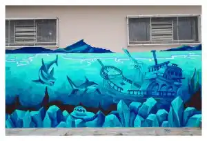El último mural lo pintó Ceb. En esta porción se ven cristales de roca acuáticos en primer plano a lo largo de toda su intervención. Además, hay tiburones que pretenden ingresar en un barco hundido, estropeado por el paso del tiempo y el cual representa los restos que dejamos luego de perecer, luego de nuestro tránsito por este mundo desafortunado.