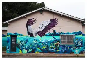 A continuación está el mural pintado por Poshy. Es el centro de la composición. En él se puede ver como figura principal una garza a punto de atrapar a un pez. Al mismo tiempo, hay una persona en una canoa pescando y disfrutando del entorno natural que lo rodea.