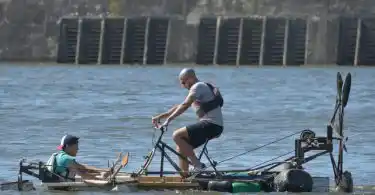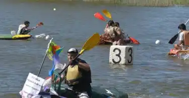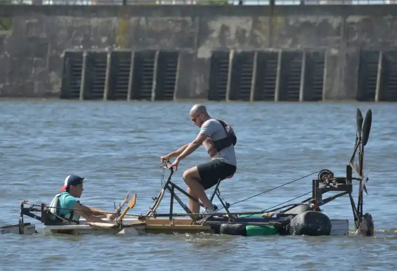 Una vez en el agua, los participantes comenzaron a transitar el circuito creado y muchos celebraron la flotabilidad de sus creaciones, mientras que otros batallaron para tratar de avanzar y maniobrar entre las boyas.