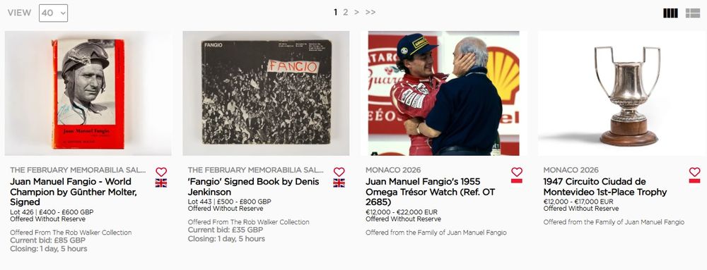 En este caso, los lotes se ofrecen con precios que van desde 2.500 hasta 22.500 euros, según el catálogo de RM Sotheby’s, quien el año pasado vendió el Mercedes-Benz W196R Stromlinienwagen de 1954, con el que el piloto de Balcarce ganó el Gran Premio de Argentina de 1955. En ese caso, la subasta fue llevada a cabo en el Museo Mercedes-Benz de la ciudad alemana de Stuttgart y el rodado se vendió en 53.917.370 millones de dólares.