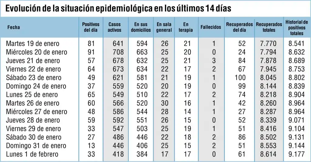 El Comité de Seguimiento de Covid-19 realizó anoche el último reporte epidemiológico, en una jornada con más de cien muestras procesadas y 33 casos positivos. En tanto, indicó que en las últimas horas se recuperaron 61 pacientes, por lo que el número de casos activos descendió a 418, respecto de los 446 del domingo.