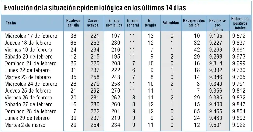 Actualmente hay 254 casos con coronavirus, de los cuales 11 se encuentran alojados en las áreas de terapia intensiva o intermedia y 9 ocupan camas en sala general.