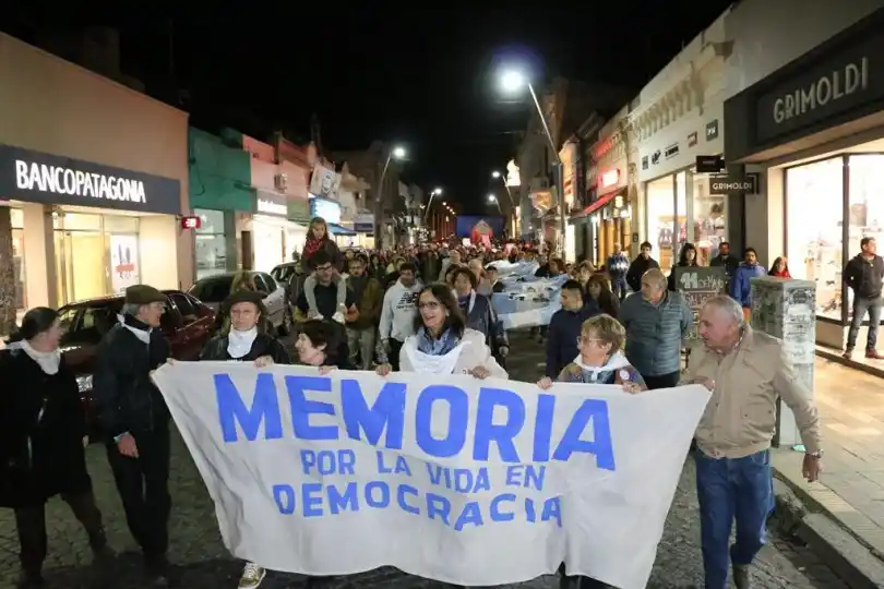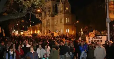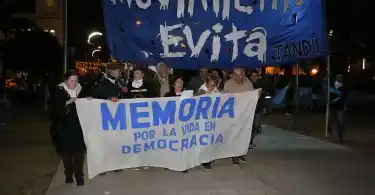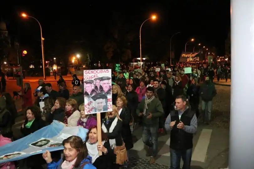 Minutos después se hizo lectura de un comunicado y alrededor de las 19 la multitud se encolumnó detrás de la bandera “Memoria por la Vida en Democracia”, portada por familiares de desaparecidos de Tandil, seguida por una inmensa bandera argentina que se entendía a lo largo de varios metros. Desde la Plaza Independencia, pasando por la pirámide, marcharon por Pinto hasta 9 de Julio, luego hasta Mitre y regresaron por Rodríguez al punto de partida. Con carteles que expresaban “Memoria, verdad y justicia. Nunca más”, “La memoria no se negocia”, “No perdonamos, no reconciliamos”, “Juicio políticos a los jueces del dos por uno”, la multitud recorrió las calles céntricas en un sentido repudio al fallo.