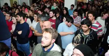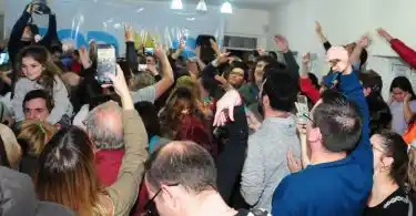 Media hora después de las 22, cuando los guarismos ya marcaban 47 a 32 por ciento a favor de Alberto Fernández, la algarabía se apoderó del salón principal y también del patio, donde muchos estaban reunidos para comentar los pormenores de la elección y esquivar el calor que se respiraba adentro.